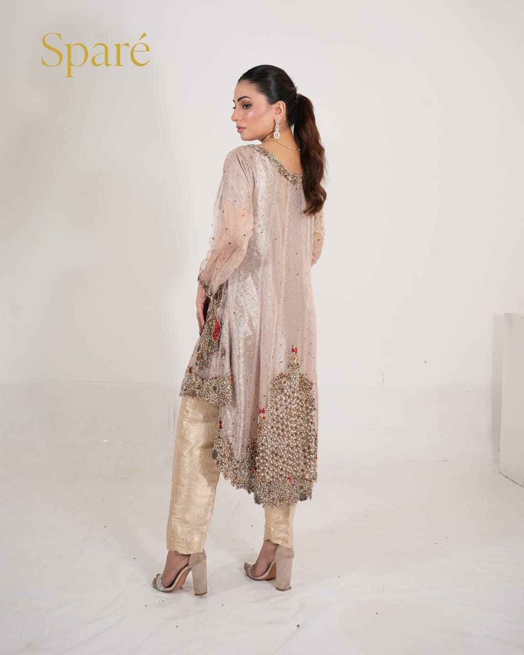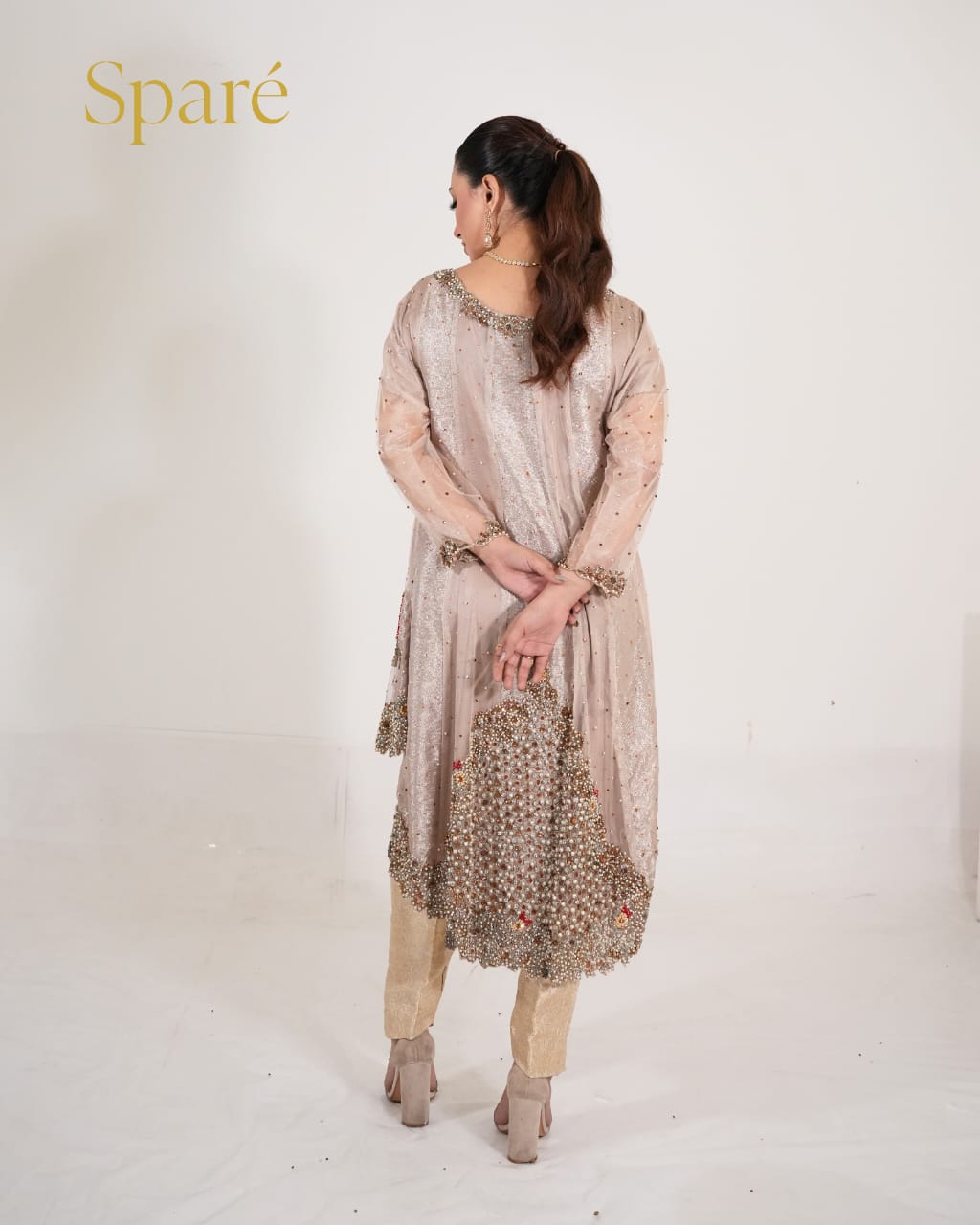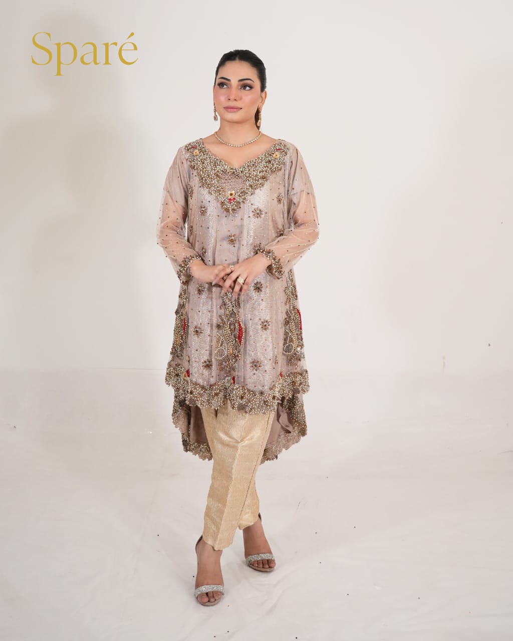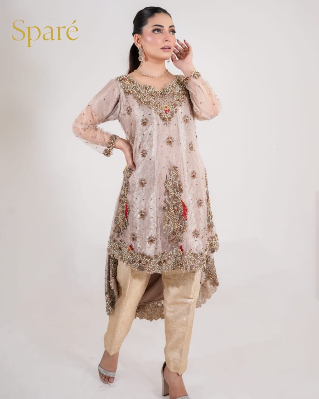 - Outfit:Long embellished A-line gown (slightly flared from the back) with jamawar trouser